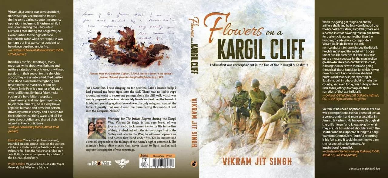 “Flowers on a Kargil Cliff” के लेखक और प्रसिद्ध डिफेंस रिपोर्टर विक्रमजीत सिंह ने उन ऊंचाइयों पर जो देखा, वह महज गोलियों और बारूद का मंज़र नहीं था। उन श्वेत हिमाच्छादित पर्वतों पर बिखरे खून के दाग़ थे, उन वीरों की असीम वीरता की निशानी के, जो वहां अपने परिवार और जीवन से दूर, हर पल मौत का सामना कर रहे थे। किताब में उन रातों का ज़िक्र है जब लेखक ने 12 जम्मू एंड कश्मीर लाइट इन्फैंट्री के जवानों के साथ 15,700 फीट पर छोटे-से तंबू में रात गुज़ारी, गोलियों की बौछार के बीच छिपते-छिपाते रिपोर्टिंग की और दुनिया को युद्ध की पहली-पहली झलक दिखाई। उस वक्त भारतीय सेना ने लेखक को यह खास अनुमति उसकी साहसिक पत्रकारिता की वजह से दी, जिसे उसने श्रीनगर में रहते हुए कश्मीर में कई ऑपरेशंस को कवर कर साबित किया था।
