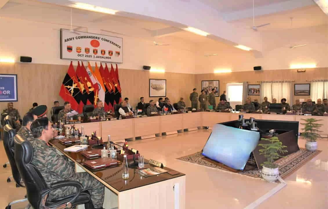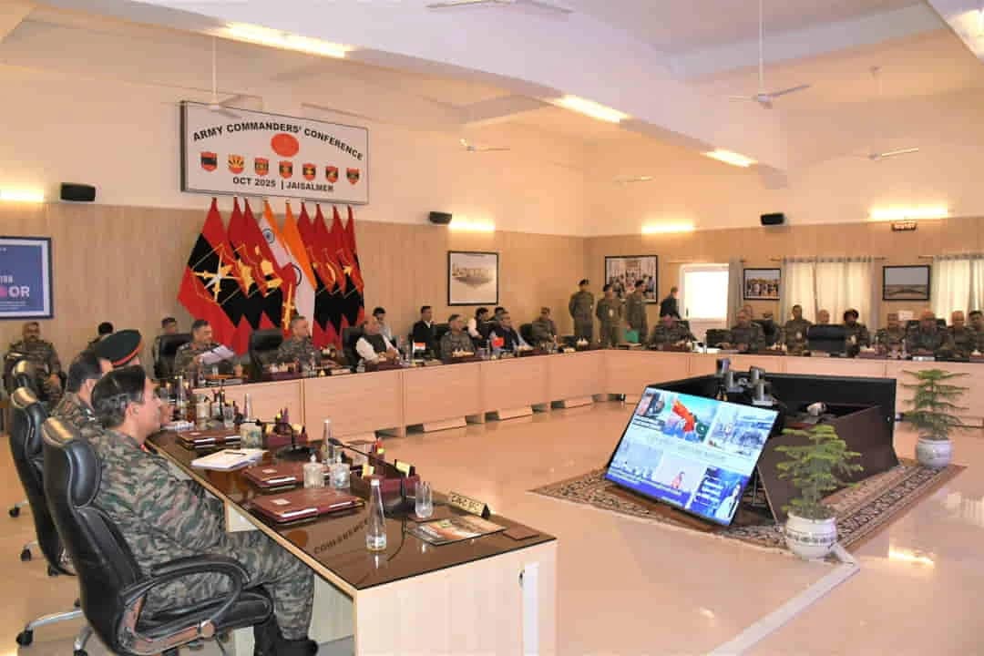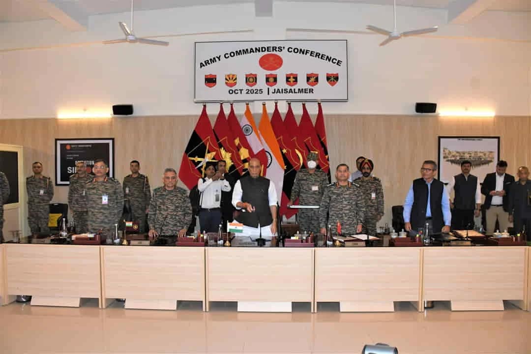 रक्षा मंत्री ने जैसलमेर में आयोजित आर्मी कमांडर्स कॉन्फ्रेंस 2025 को संबोधित किया, जिसमें चीफ ऑफ डिफेंस स्टाफ जनरल अनिल चौहान, आर्मी चीफ जनरल उपेंद्र द्विवेदी, डिफेंस सेक्रेटरी राजेश कुमार सिंह, वाइस चीफ लेफ्टिनेंट जनरल पुष्पेंद्र सिंह और सभी आर्मी कमांडर मौजूद थे। इस सम्मेलन में सेना की मौजूदा तैयारी, सीमाओं की सुरक्षा स्थिति और आत्मनिर्भरता की दिशा में उठाए जा रहे कदमों पर विस्तार से चर्चा हुई।