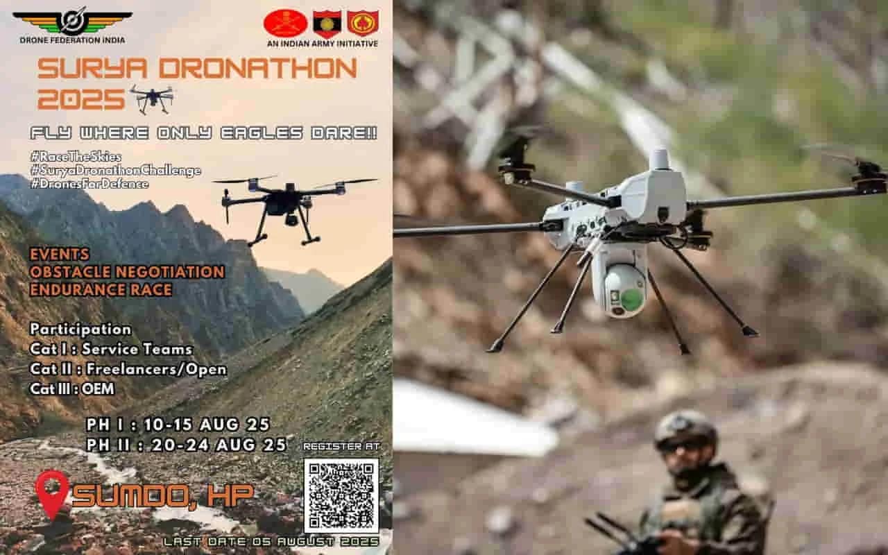 Surya Dronathon 2025: हिमाचल प्रदेश की बर्फीली और दुर्गम स्पीति घाटी देश के सबसे बड़े मिलिट्री ड्रोन कंपटीशन की मेजबानी करने जा रही है। भारतीय सेना की ‘सूर्य कमान’ (Surya Command) और ड्रोन फेडरेशन ऑफ इंडिया के सहयोग से ‘सूर्य ड्रोनाथन 2025’ (Surya Dronathon 2025) का आयोजन किया जा रहा है। यह आयोजन आत्मनिर्भर भारत अभियान और सेना की आधुनिक तकनीक अपनाने की दिशा में एक बड़ा कदम माना जा रहा है।